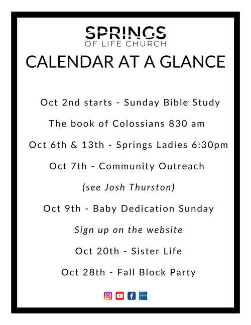 Ladies Bible Study 630pm Oct 6 and Oct 13 on the book of Ephesians.