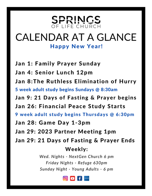 Are you ready to get your finances in order? Sign up for Financial Peace University by clicking HERE and join Jon Furrow at Springs of Life on Thursdays starting Jan 26th. It is a nine-week study from 6:30 to 8pm every Thursday night.