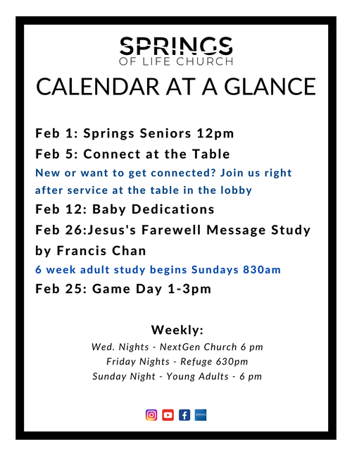 Join us after church, on February 5th at Noon, for a 20-30 minute connect meet and greet with other new people, key leaders, and community members. (Time is subject to change based on end of service)