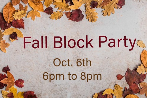 Join us on October 6th from 6pm to 8pm for a Fall Block Party.
